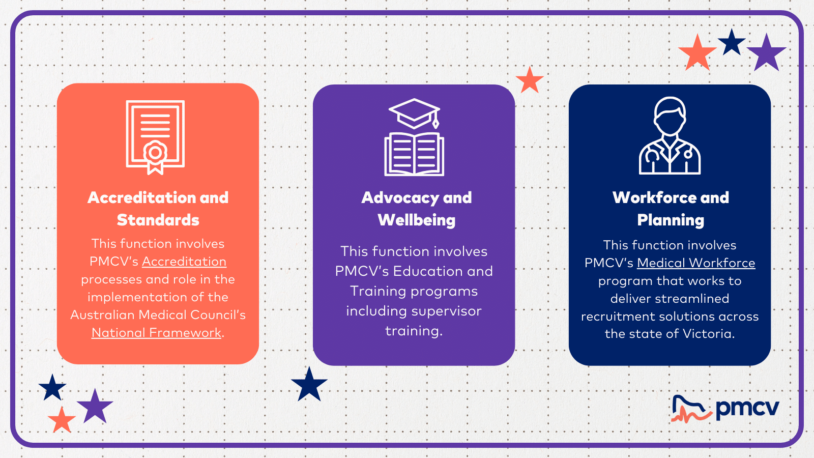 PMCV’s 14 team members work across each of our core functions and collaborate frequently with various stakeholders, from public health organisations to prevocational doctors, in order to fulfil our vision and purpose.