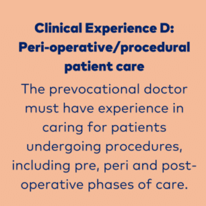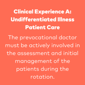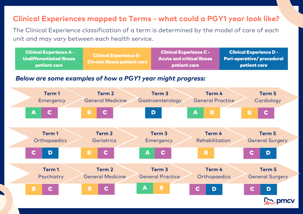 PGY1 doctors are required to gain experience in all four Clinical Experiences, whilst PGY2s will be required to gain experience in categories A, B and C. In PGY2 there is also the opportunity to undertake a term in non-direct clinical care (for example: medical education/administration, pathology or research).